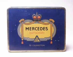 BATSCHARI Mercedes Cigarette - Seit 1880 firmierte das Unternehmen unter August Batschari Cigarettenfabrik (Kürzel: ABC). Während der Weltwirtschaftskrise geriet das Unternehmen in wirtschaftliche Schwierigkeiten und wurde 1929 an Reemtsma verkauft. Reemtsma produzierte die Marke Mercedes noch bis in die 1960er Jahre. Unser Objekt ist eine 50er Blechpackung der Mercedes Cigarette. Eine reine Orientmischung, ovales Format und ohne Filter. Die Blechpackung, in dunkelblau gehalten und wirkt vornehm. Dazu trägt auch das aufgedruckte, in einem warmen gelbton gehaltene Feld bei, das von Bordüren und der Batschari Krone eingerahmt, den Namen Mercedes/Batschari prominent darstellt. Die Deckel Innenseite ist einfarbig mit Namen, der Batschari-Krone und dem ABC-Logo bedruckt.