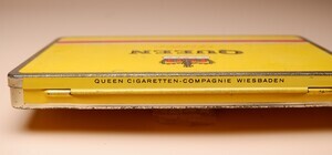Die Queen Cigarette mit Filter (Korkmundstück) in der 50er Geschenkpackung dürfte aus den 60er Jahren stammen. Über die Marke selbst, sowie den Hersteller aus Wiesbaden, konnten wir nur wenig herausfinden. Die Blechpackung war für 50 Cigaretten vorgesehen. Sie ist in einem warmen gelbton gehalten und mit einer Krone sowie dem Namen "QUEEN Filter" bedruckt. Ein rundum laufender Goldrahmen schließt das Packungsbild ab.