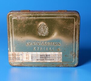 I. Kyriazi gründete, zusammen mit seinen Brüdern, 1873 in Cairo/Ägypten die Zigarettenfabrik Kyriazi Freres. Es wurden Unternehmen in Amsterdam und 1925 in Hamburg eröffnet. Nach dem 2. WK wurde eine Fabrik in Berlin gegründet. In den 1960er Jahren wurde Kyriazi von der BAT übernommen. Zwischen 1957-1972 wurde die Marke EGYPTICA in Berlin produziert. Unser Objekt ist eine leere 20er Blechpackung, etwa aus dem Jahr 1970. Neben dem Markennamen EGYPTICA ist auf dem Deckel noch der Firmenname mit Herkunftshinweis „Cairo (EGYPT)“ aufgedruckt. Auf der Rückseite findet sich ein Teil der Steuerbandrole, mit dem Aufdruck „Kyriazi –Berlin Packung 2,50 DM“, erhalten.