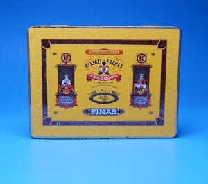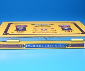 I. Kyriazi gründete zusammen mit seinen Brüdern 1873 in Cairo/Ägypten die Zigarettenfabrik Kyriazi Freres. Es wurden Unternehmen in Amsterdam und 1925 in Hamburg eröffnet. Nach dem 2. WK wurde auch eine Fabrik in Berlin gegründet. In den 1960er Jahren wurde Kyriazi von der BAT übernommen. Unser Objekt ist eine Blechpackung für 50 Stück Zigaretten. Die gelbe Außenseite des Deckels ist großflächig mit "Egyptian Cigarettes Manufactory und KYRIAZI FRERES Cairo (Egypt) sowie dem Markenname FINAS" bedruckt. Die Deckelinnenseite ist der Werbung in eigener Sache vorbehalten. Auf der Rückseite findet sich noch ein Teil der Steuerbandrole, mit dem Aufdruck „Kyriazi 50 Zigaretten – Das Stück für 10 Pfg.“