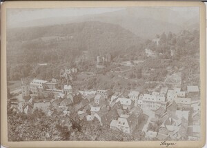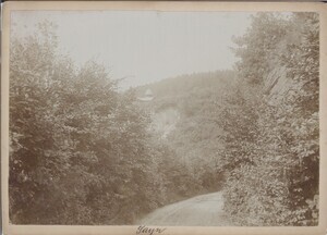 Schwarzweiß Fotografie in grauem Passepartout. Motiv ist der Aussichtspavillon auf der sog. Oscar-Höhe in Sayn, von der man einen wunderschönen Blick in das Brexbachtal mit Abtei und Alt-Sayn hat. Der 1896 vom Direktor der Sayner Hütte, Oscar Kroeber, mit Gleichgesinnten gegründete Verschönerungsverein Sayn hatte es sich zur Aufgabe gemacht Wanderwege anzulegen, Aussichtspavillons zu errichten und Ruhebänke entlang der Wege aufzustellen. Der hier dargestellt Pavillon wurde nach dem Hüttendirektor benannt. Das Foto hat Oscar Kroeber auch selbst aufgenommen und u.a. für ein Fotoalbum für Friedrich Alfred Krupp zum Geschenk, aber auch für Postkarten und die Wanderführer des Verschönerungsvereins verwendet. Auch heute noch existiert an derselben Stelle ein Aussichtspavillon und es führen verschiedene Wanderrouten (Saynsteig, Rheinsteig, Traumpfädchen) an dem Aussichtspunkt vorbei.