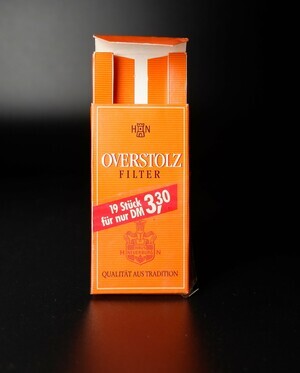 Unser Objekt ist eine Werbepackung für 3 Zigaretten der Marke Overstolz Filter. Die Packung hat das Orange der Markenfamilie und ist bedruckt mit dem Markennamen, dem Wappen „Haus Neuerburg“ sowie mit dem Preishinweis 19 Stück für nur 3,30 €. Der Warnhinweis des Bundesgesundheitsministers findet sich seitlich. Auf der oberen Deckellasche der Pflichttext: „3 Cigaretten versteuert, unentgeltliche Werbeprobe.