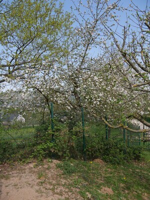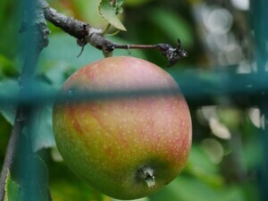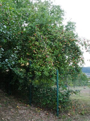Die Apfelsorte Geheimrat Dr. Oldenburg wurde1897 an der damaligen Höheren Lehranstalt für Obstbau zu Geisenheim gezüchtet. Es handelt sich dabei um eine Kreuzung aus den Sorten Minister von Hammerstein und Baumanns Renette. Die ersten Äpfel wurden 1904 geerntet und zu Ehren von Geheimrat Regierungsrat Dr. Oldenburg, vortragender Rat im damaligen landwirtschaftlichen Ministerium in Berlin, benannt. Die Äpfel der Sorte Geheimrat Dr. Oldenburg sind mittelgroße, hochgebaute Tafelfrüchte mit gelbgrüner, auf der Sonnenseite teils kräftig roter Schale. Das Fruchtfleisch ist locker und saftig. Der Geschmack ist fein süßsäuerlich. Die Apfelsorte wird nur selten gewerbsmäßig angebaut. Die geschmackliche Qualität der Äpfel gilt „selbst auf guten Standorten“ als „bescheiden“. Indes ist die Apfelsorte „aufgrund ihres einzigartigen, fast exotisch wirkenden Geschmacks in vielen Liebhabergärten“ anzutreffen. Möglicherweise im Rahmen des Sortengartens Ende der 1980er-Jahre gepflanzt und deutlich weniger beschnitten als die anderen Bäume.