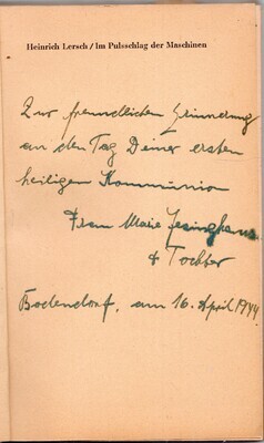 Hartkartoneinband mit Kurzgeschichten in den Kapiteln "Mensch im Werden" und "Im Pulsschlag der Maschinen". Im Einband ist Widmung von Frau Maria Jesinghaus vom 16.04.1944 zur ersten hl. Kommunion. Das Inhaltsverzeichnis befindet sich auf Seite 97.