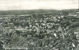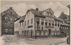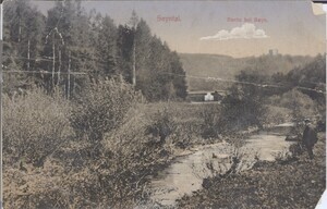 Schwarzweißfotografie als Postkarte gedruckt in der Buchdruckerei und Buchhandlung H. Bernhard in Bendorf. Die Postkarte wurde am 18. März 1937 geschrieben und am darauffolgenden Tag verschickt an Herrn Josef Malkmus. Die Postkarte zeigt einen Wanderer mit Hut auf einer unbefestigten und von Bäumen rechts und Strommasten links gesäumten Straße im Sayntal. Damals war Sayn ausgewiesener Luftkurort, wie der Beschriftung der Postkarte zu entnehmen ist.
