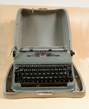 1930 erhielt die Europa Schreibmaschinen AG aus Erfurt den international geschützten Markennamen „Olympia“. Nach dem 2.Weltkrieg flohen Mitarbeiter des Erfurter Werkes samt Konstruktionsunterlagen in den Westen. In Roffhausen/Wilhelmshaven begannen sie ab 1946 wieder mit der Schreibmaschinen Produktion. Für das Wilhelmshavener Werk lautete die Firma ab 1950 Olympia Werke West GmbH und ab Juni 1954 erhielt das Unternehmen seine bekannte Firma Olympia Werke AG. Unsere Maschine, eine OLYMPIA SM 3, stammt aus der Produktion von 1957und hat die Herstellungsnummer 938 894 und hat eine grüne Kräusellack Lackierung. Technisch handelte sich um eine Typenhebelmaschine mit Vorderaufschlag, mit vierreihiger Universaltastatur, Wagenumschaltung und Tabulator. Sie verfügt über Rücktaste, Zeilenschaltung, automatische Bandumschaltung, Zweifarben Band, Randsetzer und Wagenfeststeller. Für den sicheren Transport wurde die Maschine in einem grünlichen Blechkoffer geliefert.