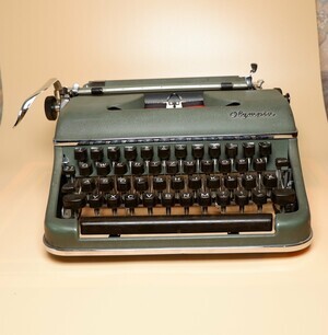 1930 erhielt die Europa Schreibmaschinen AG aus Erfurt den international geschützten Markennamen „Olympia“. Nach dem 2.Weltkrieg flohen Mitarbeiter des Erfurter Werkes samt Konstruktionsunterlagen in den Westen. In Roffhausen/Wilhelmshaven begannen sie ab 1946 wieder mit der Schreibmaschinen Produktion. Für das Wilhelmshavener Werk lautete die Firma ab 1950 Olympia Werke West GmbH und ab Juni 1954 erhielt das Unternehmen seine bekannte Firma Olympia Werke AG. Unsere Maschine, eine OLYMPIA SM 2, stammt aus der Produktion von 1955und hat die Herstellungsnummer 597 614 und hat eine grüne Kräusellack Lackierung. Technisch handelte sich um eine Typenhebelmaschine mit Vorderaufschlag, mit vierreihiger Universaltastatur, Wagenumschaltung und Tabulator. Sie verfügt über Rücktaste, Zeilenschaltung, automatische Bandumschaltung, Zweifarben Band, Randsetzer und Wagenfeststeller. Der ursprünglich mitgeliefewrte Transportkoffer ist nicht mehr vorhanden.