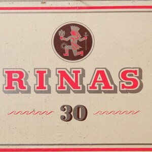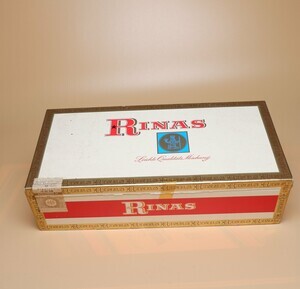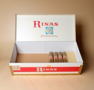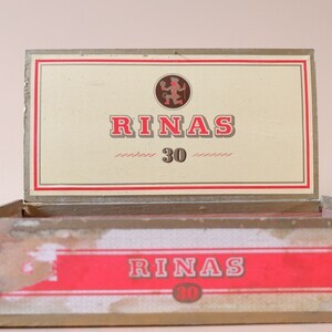 Mit dem Ziel, den Zigarrenabsatz in Deutschland zu fördern, schlossen sich in den 1950er Jahren, namhafte Tabakwarengroßhändler zu einer Einkaufs- und Werbegemeinschaft zusammen. Die Händlermarke "Feine Rinas -Zigarren" wurde sehr erfolgreich in Deutschland verkauft. Als Hersteller standen u.a. R & C (Rinn und Cloos), Neuhaus Zigarren aus Schwetzingen oder auch die Firma Burger-Stumpen zur Verfügung. Unser Objekt ist eine Zigarrenschachtel RINAS 30 (Holz) aus den frühen 1960er Jahren und eine Schachtel RINAS 33 (Pappe) aus den frühen 1980er Jahren. Der Preis änderte sich in dieser Zeit von 30 auf 35 Pfennig/Stück. Die Zigarre selbst bestand aus einer grob gehäckselte ""Einlage“, dem Umblatt und dem spiralförmig gewickelte Deckblatt. Aus Kostengründen wurde bei den Konsumpreislagen –wie auch bei unserem Objekt- das teure Deckblatt durch eine Tabakfolie (homogenisiertes Umblatt) ersetzt. Hinzu kam, dass der Verbraucher eine helle Zigarre bevorzugte, da „hell“ mit "leicht" assoziiert wurde. Die Industrie kam diesem Verbraucherwunsch entgegen und brachte die „farbmattierte“ Zigarre auf den Markt. Die benötigte Mattiercreme bestand aus Tabakmehl, Talk, Titandioxyd und Farbstoff. Der einheitliche Auftritt gefiel dem Kunden und wurde honoriert.