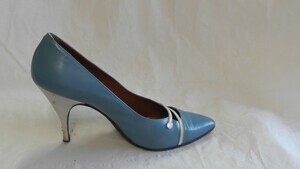 Ein Paar Riemenpumps aus schwarzem Kunststoff. Spitze Form, mit Kunststoff und Leder bezogener Absatz (ca. 7cm), je ein Riemen mit Elastikband dient der Befestigung. Die Schuhe verfügen über Zehenöffnungen und goldene gekreuzte Einsätze aus Leder. Hergestellt in Taiwan für die Marke Tamaris. Datiert auf die 1980er Jahre.