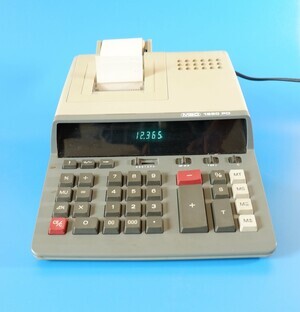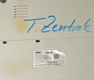 Aus einem Teil des Kombinats Robotron, der ex DDR, sind mehrere MBO (Management By Out) Firmen hervorgegangen. Welche Firma unser Objekt, den Standard Tischrechner MBO 1980 PD, hergestellt hat konnten wir nicht in Erfahrung bringen. Der 12-stellige, Rechner hat eine digitale Anzeige und ein integriertes Druckwerk. Gedruckt wir auf eine 55mm breite Papierrolle, wobei das 2-Farbenband negative Werte in rot druckt. Unser Objekt stammt aus der Firmenauflösung KARSTADT in Trier. Auf der Unterseite des Rechners ist handschriftlich der Einsatzort, die Telefonzentrale des Kaufhauses, festgehalten.
