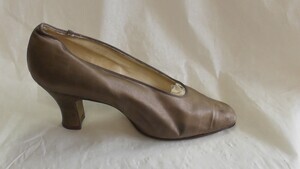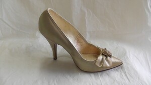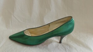Ein Paar Pumps aus dunkelblauem Satin-Stoff. Spitze Form, mit Satin bezogener und metallgenagelter Pfennigabsatz (ca. 6cm). Damengröße 8,5. Die Schuhe verfügen über je eine Zierschleife aus Satin-Stoff. Datiert auf 1962.