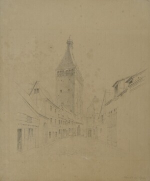 Das °Kloster zum Heiligen Grab° lag nördlich der Vorstadt Altspeyer zwischen Wormser Tor und Diebsturm (heute Aral-Tankstelle). Die Klosterkirche wurde auch "Templerrotunde" genannt, denn wurde als Zentralbau nach dem Vorbild der Heilig-Grab-Kirche in Jerusalem errichtet. Das Kloster bestand bis 1585. Danach wurden die Gebäude von der Stadt Speyer als Lazarett genutzt. Das °Lazaretthaus° am Wormser Tor wurde auch 1792 noch erwähnt Als die Wormser Straße zwischen 1809 und 1813 neu angelegt wurde und sich die Stadt weiter ausbreitete, verschwanden Teile des Klosters. Die Zeichnung Gayers um 1820/25 zeigt wohl den Zustand der Klosterkirche kurz vor ihrer Beseitigung. Peter Gayer war bayerischer Regierungsbeamter und seit 1823 Leiter des Kreisarchivs des Bayerischen Rheinkreises in Speyer (heute Landesarchiv). Von seiner Hand sind viele Darstellungen von Architekturzeugnissen der Pfalz erhalten. Darunter finden sich Ruinen der zerstörten Stadt Speyer, die bis zur Mitte des 19. Jahrhunderts teilweise abgerissen wurden, aber auch kirchliche Gebäude der Pfalz. Gayer präsentiert seine Architekturzeichnungen gerne im Kleid der romantischen Ruinendarstellungen seiner Zeit und versieht sie zugleich mit figürlicher Staffage.