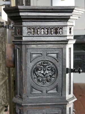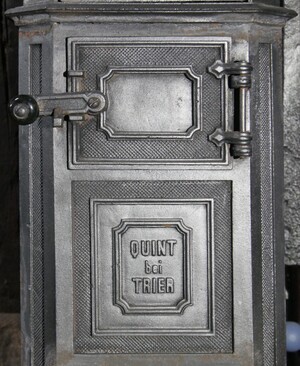 Ein eher frühes Exemplar (um 1870) eines Regulierofens und Kochofens. Über der Brennkammer befindet sich hinter einer durchbrochene Tür ein Fach um Essen warm zuhalten. Oben auf dem Ofen ist eine Platte die dem selben Zweck diente. Da keine Ofenringe vorhanden sind, kann man davon ausgehen, dass dieser Ofen nicht zum Kochen und nur zum Warmhalten bereits gekochter Speisen genutzt wurde. Dieser Ofentyp wurde ab ca 1870 hergestellt. Durch die verschiedenen Regulierschrauben konnte der Ofen auch im Dauerbetrieb eingestellt werden. Die Knöpfe der Regulierschrauben sind leider nicht mehr vorhanden. Der Rest der Reguliereinrichtung ist festgelötet. Rund um den Ofen Dekor im Stil der Neo-Renaissance. Der Firmanname "Quint" befindet sich vorne etwa in der halben Höhe des Ofens. Er ist also ein Heizofen mit Kochmöglichkeit. Hergestellt wurde der Ofen von der Eisenhütte in Quint (heute ein Stadtteil von Trier). Diese wurde 1683 gegründet und entwickelte sich im Laufe der Zeit zu einem bedeutenden Unternehmen. Sie betrieb von 1857 bis 1891 bei Schweich ein eigenes Eisenbergwerk. Nach mehrfachem Besitzerwechsel kommt das Unternehmen zum Klöckner-Konzern, der 1925 das Walzwerk stilllegt und zum 31.1.1972 diesen Unternehmensteil ganz aufgibt. Quint-Öfen wurden von Ende des 17. Jahrhunderts bis 1960 hergestellt. Heute (2021) sind nur noch das Schloss des Hüttenherrn und einige Verwaltungsgebäude erhalten.
