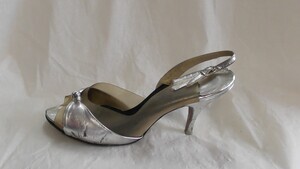 Ein Paar Damensandaletten aus lilafarbenem Leder. Spitze Form, mit Leder bezogener und metallgenagelter Absatz (ca. 9cm), je ein Riemen mit Schnalle dient der Befestigung. Über den Spann ziehen sich asymmetrische Riemen. Hergestellt in Spanien. Datiert auf die 1980er Jahre.