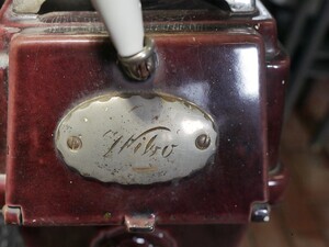 Dunkelroter emaillierter Füllregulierofen der irischen Bauart, Hergestellt von der Firma Wibo (Hamburg). Ganz oben eine Klappe zum Einfüllen des Brennguts. Reguliermöglichkeiten am Ausgang zum Schornstein oben, hinten am Ofen und unten an der Tür zum Aschekasten. Innen Auskleidung mit Schamotte. Ein Firmenschild ist an der oberen Klappe angebracht. Zurückhaltender Dekor auf drei Seiten im Stil der 1920er Jahre. Die Firma existiert 2021 immer noch und stellt heute elektrische Heizgeräte her.