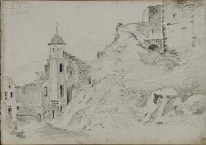 Ansicht der Kropsburg bei St. Martin im Landkreis Südliche Weinstraße in der Pfalz. Die Burg wurde 1689 zerstört. Im Hof der Unterburg wurde 1771 ein herrschaftliches Wohnhaus errichtet. Anmerkung des Künstlers am linken oberen Rand; °S. Martin (gestrichen) + die Kropsburg + die Vorburg Die Skizzenblätter stammen aus einem gebunden Skizzenbuch, das bei einem Aufenthalt des Landschaftsmalers und Zeichners Friedrich C. Reinermann in der Pfalz im Mai 1821 entstand. Er begann seine Wanderung bei Bad Dürkheim und besuchte vor allem bekannte Burgen der Pfalz. Reinermann erhielt seinen ersten Malunterricht bei dem Porträtmaler Cramer in Wetzlar. Danach arbeitete er als Schüler bei dem Frankfurter Künstler Johann Andreas Benjamin Nothnagel (1729–1804). Anschließend war er als Tapetenmaler in Wetzlar tätig. Es folgte 1789 ein Studienaufenthalt in Kassel. Im Jahr 1789 reiste er nach Italien und verbrachte einige Monate in Rom, wo er Schüler von Louis Ducros (1747–1810) war. Reinermann spezialisierte sich auf Aquatintaradierungen. Von 1803 bis 1811 lebte Reinermann in Frankfurt am Main. 1812 wurde er zum "Professor der bildenden Künste" ernannt und erhielt 1818 eine Anstellung als Lehrer an der Kunstschule in Frankfurt am Main.