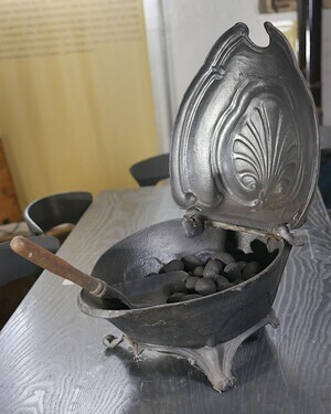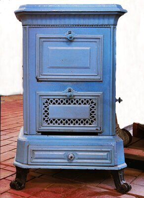 Kohlenfrosch (Kohlebecken) aus Guise. Der Kohlefrosch stand normalerweise neben dem Kohleofen um nicht bei jedem Nachschüren in den Kohlenkeller gehen zu müssen. Etwa 2/3 des Deckels sind aufklappbar um in das darunterliegende Gefäß Kohlen hineinzuschütten bzw. wieder heraus nehmen zu können. Der vordere Fuß von 3 Füßen ist beschädigt. Der Hersteller ist Fonderies et manufactures Godin-Lemaire. Das Modell des Kohlebehälters Nr. 5 erscheint im Album der Manufaktur aus dem Jahr 1867. Es wurde 1934 immer noch im Katalog der Firma aufgeführt. Der Behälter fasst 12 bis 13 kg Kohle. Der Behälter ist auf einem Sockel mit drei Beinen montiert. Der Deckel ist mit einer Muschel verziert. Die Oberseite und der Sockel des Exemplars des Familistère de Guise bestehen aus grün emailliertem Eisenguss, während sein Behälter schwarz emailliert ist. (Quelle für diesen Absatz: https://www.familistere.com/fr )