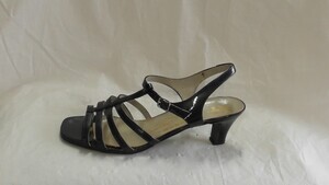 Ein einzelner Kinder-Spangenschuh aus schwarzem Lackleder. Spitze Form, mit Leder bezogener Absatz (ca. 2cm), ein Riemen mit Schnalle dient der Befestigung. Die Schnalle ist mit Lackleder bezogen. Es handelt sich um ein Einzelstück, welches als Vertretermuster gefertigt wurde. Hergestellt in Vietnam. Datiert auf die 1980er Jahre.