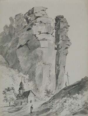 Die Michaelskapelle befindet sich unterhalb des Hochsteinmassivs bei Dahn. Die Kapelle wurde 1952 renoviert und wurde in die Anlage eines Soldatenfriedhofs (mit Gefallenen bei Kämpfen in der Pfalz zwischen 1940 und 1944) integriert. Ortsangabe von der Hand des Künstlers am oberen Rand der linken Skizzenbuchseite: °Michaelskapelle bei Dahn°. Die Skizzenblätter stammen aus einem gebunden Skizzenbuch, das bei einem Aufenthalt des Landschaftsmalers und Zeichners Friedrich C. Reinermann in der Pfalz im Mai 1821 entstand. Er begann seine Wanderung bei Bad Dürkheim und besuchte vor allem bekannte Burgen der Pfalz. Reinermann erhielt seinen ersten Malunterricht bei dem Porträtmaler Cramer in Wetzlar. Danach arbeitete er als Schüler bei dem Frankfurter Künstler Johann Andreas Benjamin Nothnagel (1729–1804). Anschließend war er als Tapetenmaler in Wetzlar tätig. Es folgte 1789 ein Studienaufenthalt in Kassel. Im Jahr 1789 reiste er nach Italien und verbrachte einige Monate in Rom, wo er Schüler von Louis Ducros (1747–1810) war. Reinermann spezialisierte sich auf Aquatintaradierungen. Von 1803 bis 1811 lebte Reinermann in Frankfurt am Main. 1812 wurde er zum "Professor der bildenden Künste" ernannt und erhielt 1818 eine Anstellung als Lehrer an der Kunstschule in Frankfurt am Main