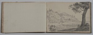 Blieskastel ist der Hauptort des Bliesgaus. Die im Jahr 1821 entstandene Skizze zeigt den Bereich des ursprünglichen Fleckens Blieskastel, der 1773 zur Residenzstadt der Grafen von der Leyen aufgewertet wurde, nach der Französischen Revolution und in der napoleonischen Zeit unter französischer Herrschaft stand und seit 1816 zum Rheinkreis des Königreichs Bayern gehörte. Reinermann zeichnet ein friedliches Bild von der Stadt, gesehen von den Wiesen an der Blies aus, auf der einige Kühe weiden. Von links nach rechts erblickt man die frühere Franziskaner-Klosterkirche (1776-1781, heute "Schlosskirche"), daneben den "Langen Bau" (1670, heute als Orangerie bezeichnet, der einzig erhaltene Rest der einst weitläufigen Schlossanlage (Baubeginn 1661), die während der Französischen Revolution zerstört wurde). Rechts neben der Schlossmauer ist ein Teil der früheren Pfarrkirche St. Sebastian (1664-1680) zu erkennen, die 1809 aufgegeben und 1934 abgerissen wurde. Von der am Fuß des Schlossbergs im Tal gelegenen Stadt Blieskastel ist das im Rahmen der Residenzverlegung und Stadterweiterung 1774-1775 errichtete Oberamts- und Waisenhaus, das heutige Rathaus, neben weiteren Gebäuden am Paradeplatz dargestellt. Im Hintergrund die am Berghang gelegene Heilig-Kreuz-Kapelle (1682/83). Auf dem Berg über der Stadt erkennt man als kleine rechteckige Markierung den "Gollenstein", einen rund 7 m hohen Menhir, das Wahrzeichen Blieskastels. Bei der terrassenförmig Gartenanlage am südlichen (linken) Berghang handelt es sich um den "Antikengarten" des von-der-leyen'schen Archivars, späteren Friedensrichters und Hobby-Archäologen Franz Carl Dercum (1763-1825), in dem er archäologische Fundstücke aufgestellt hatte, darunter das Jupiter-Relief, das sich heute im Historischen Museum der Pfalz befindet. (Mit herzlichem Dank an Walter Ruby, Kirkel, dem das Historische Museum die genaue Identifizierung der dargestellten Gebäude und Anlagen verdankt). Der Künstler schreibt dazu am oberen Rand des linken Skizzenbuchblattes: °Blieskastel 2 Stund' von Zweibrücken°. Die Skizzenblätter stammen aus einem gebunden Skizzenbuch, das bei einem Aufenthalt des Landschaftsmalers und Zeichners Friedrich C. Reinermann in der Pfalz im Mai 1821 entstand. Er begann seine Wanderung bei Bad Dürkheim und besuchte vor allem bekannte Burgen der Pfalz. Reinermann erhielt seinen ersten Malunterricht bei dem Porträtmaler Cramer in Wetzlar. Danach arbeitete er als Schüler bei dem Frankfurter Künstler Johann Andreas Benjamin Nothnagel (1729–1804). Anschließend war er als Tapetenmaler in Wetzlar tätig. Es folgte 1789 ein Studienaufenthalt in Kassel. Im Jahr 1789 reiste er nach Italien und verbrachte einige Monate in Rom, wo er Schüler von Louis Ducros (1747–1810) war. Reinermann spezialisierte sich auf Aquatinta-Radierungen. Von 1803 bis 1811 lebte Reinermann in Frankfurt am Main. 1812 wurde er zum "Professor der bildenden Künste" ernannt und erhielt 1818 eine Anstellung als Lehrer an der Kunstschule in Frankfurt am Main.
