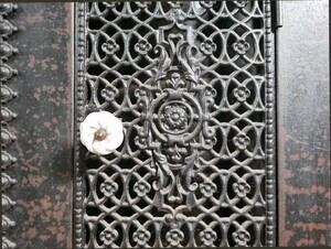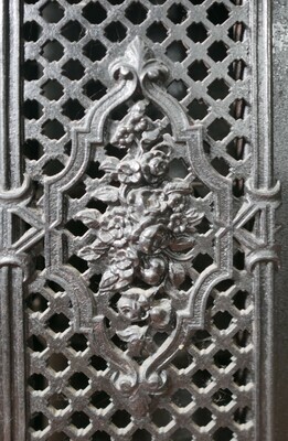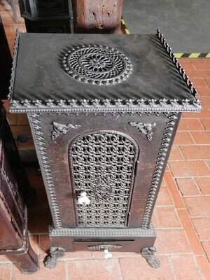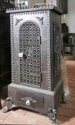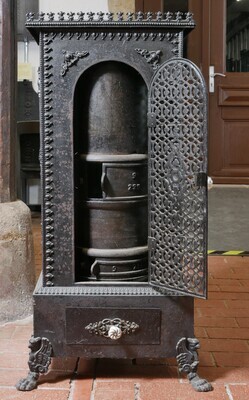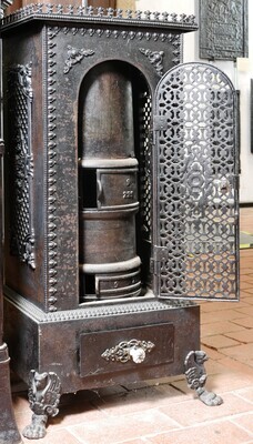 Mantelofen. Bei dem Ofen im Inneren handelt es sich um einen Regulierofen/Rundofen mit zwei Schiebevorrichtungen und Aschekasten. Der oberen Schieber; etwa auf halber Höhe des Ofens; dient zum Befüllen des Ofens. Der untere Schieber befindet sich unter dem Rost und über dem Aschekasten und dient der Regulierung der Luftzufuhr. Um den Ofen herum befindet sich der viereckige Mantel. Er schützt inbesondere Kinder und Hunde davor sich an dem heißen Ofen zu verbrennen. Oben links und rechts sind in dem Mantel Gitter mit Gründerzeitdekor für die Konvektion der Luft eingelassen. An der Frontseite befindet sich das Gitter in einer Türe, durch die man den Ofen warten und befüllen kann. Der Aschekasten steht auf Greiffüßen einem Sockel. Auf dem Mantel sind weitere Zierelemente angebracht. Den Ofen bekrönt ein First.