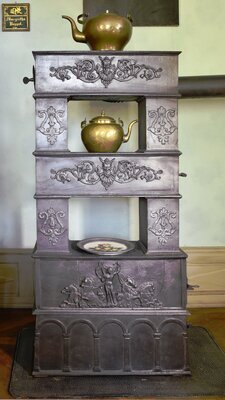 Zirkulierofen aus Gusseisen auf vier schmalen und im Vergleich zum Ofen sehr hohen Füßen mit Ornamenten und Löwenpfotendekor. Hergestellt durch die Weilerbacher Hütte bei Bollendorf. Firmenname über der Klappe der Brennkammer. Kleiner Ofen der nur 1 Stockwerk über der Brennkammer besitzt. Die Felder des Ofens sind mit Schuppendekor verziert. Die Brennkammer besitzt keinen Rost, sodass mit diesem Ofen nur Holz und Torf, aber keine Kohle verfeuert werden konnte. Zuunterst befindet sich die Brennkammer. Befeuert wurde der Ofen in unserer Gegend wohl mit Holz, andernorts auch mit Torf. Der Aschenkasten ist nicht mehr vorhanden. Was den Etagen- oder Zirkulierofen ausmacht, beginnt ein Stockwerk höher. Über die darüberliegende(n) Etage(n) wurden die Rauchgase durch horizontale und vertikale Kanäle, wechselnd rechts und links geführt, die eine optimale Energieausbeute gewährleisten sollten. es besteht keine Möglichkeit der Regulierung der Luftzufuhr in der Brennkammer. Es ist nur ein nicht regulierbares Loch ist in dem Türchen vorhanden.
