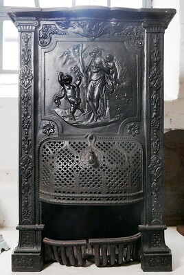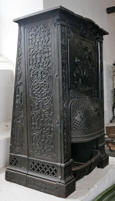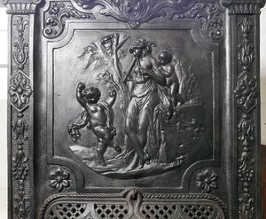 Ein "offener Kamin" aus Eisen. Er bestand normalerweise aus Branschutzgründen ganz aus Stein. Dieser ist aus Gusseisen. Er wurde um Brenngut zu sparen in einen gemauerten Offenen Kamin eingesetzt. Ganz unten konnte man das Brenngut - Holz oder Torf - in die Brennschale einlegen. Bei unserem Exemplar ist diese leider zerbrochen. Darüber ist am Ofen eine Art eisener Schirm eingehängt, der wohl Funkenflug verhindern sollte. Darüber befindet sich eine Art Ofenplatte mit einer Doppelflöte spielenden Nymphe - also ein antiker Naturgeist - mit Eroten, im Barock auch als Putten bezeichnet werden. War wohl nötig in einer Zeit in der es weder onlyfans noch den Playboy gab... Das Objekt ist darüberhinaus auf der Frontseite und den beiden Seiten nahezu flächendeckend mit Ornamenten versehen. Selbst auf der Rückseite ist ein Relief, das möglicherweise Herakles mit 2 Säulen zeigt (ist derzeit leider nicht fotografierbar). Im Vergleich zu einem gemauerten Offenen Kamin nutzt er die Wärme des Brennholzes viel besser aus. Der durchbrochene und ursprünglich abnehmbare Deckel ist recht mit verschlungenen Ornamenten verziert. In der Mitte befindet sich ein Medallion mit einer nach unten fliegenden Schwalbe, dem Logo des Herstellers "Société générale de Chauffage". Über dem Logo befindet sich der Schriftzug "Cheminees Russes" Zum einen ist de Brennraum kleiner, zum anderen ziehen die heissen Rauchgase zuerst hinter dem Nymphenrelief nach oben und durch einen Spalt in der inneren Zwischenwand kurz unter der Decle im hinteren Teil des Ofens in einem Sturzzug wieder nach unten. Danach verlassen sie - nachdem sie möglichst viel Wärme abgegeben haben - den Ofen in einem Ofenrohr, das etwa in halber Höhe des Ofens angeschlossen ist.