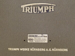 Nach dem Krieg nahm Triumph 1948 die Produktion wieder auf. Bis in die 1950er Jahre stellte Triumph hauptsächlich Schreibmaschinen, Fahrräder, Motorräder und sogar Automobile, zwischenzeitlich auch Schub- und Handkarren, her. 1950 setze Triumph mit der Büroschreibmaschine „Matura“ neue Maßstäbe in Leistung und Design. Bei unserer Maschine handelt es sich um ein Modell aus dem Jahr 1951 und wurde unter der Produktionsnummer 517 977 hergestellt. Das Gehäuse ist aus Aluminium und in dunkelgrüner Farbe lackiert. Der Wagen dieses Modell lässt sich super leicht ausbauen oder tauschen. Es müssen dazu lediglich 2 Knöpfe, auf der Rückseite, gedrückt werden. Selbstverständlich verfügt die Matura über einen Tabulator, einen Typenentwirrhebel, Matritzenbeschriftung und ein 2 Farbenband. Des Weiteren sind alle praktischen und nützliche Zubehörteile, die von Büromaschinen erwartet werden, an Bord. Technisch handelt es sich um eine Typenhebelmaschine mit Wagner Getriebe und deutscher QWERT Tastatur Auf der Rückseite fondet sich ein Aufkleber von der damaligen Verkäuferfirma. W.Christmann - Maschinen, Möbel, Organisationsmittel - Bahnhofstrasse 15 in TRIER.
