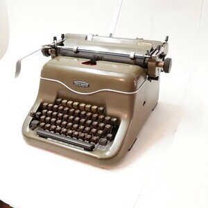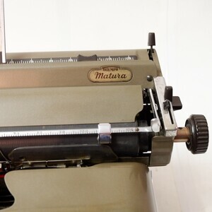 Nach dem Krieg nahm Triumph 1948 die Produktion wieder auf. Bis in die 1950er Jahre stellte Triumph hauptsächlich Schreibmaschinen, Fahrräder, Motorräder und sogar Automobile, zwischenzeitlich auch Schub- und Handkarren, her. 1950 setze Triumph mit der Büroschreibmaschine „Matura“ neue Maßstäbe in Leistung und Design. Bei unserer Maschine handelt es sich um ein Modell aus dem Jahr 1953 und wurde unter der Produktionsnummer 809704 hergestellt. Das Gehäuse ist aus Aluminiumguss und in beige-brauner Farbe lackiert. Der Wagen dieses Modell lässt sich super leicht ausbauen oder tauschen. Es müssen dazu lediglich 2 Knöpfe, auf der Rückseite, gedrückt werden. Selbstverständlich verfügt die Matura über einen Tabulator, einen Typenentwirrhebel, Matritzenbeschriftung und ein 2 Farbenband. Des Weiteren ist alles praktische und nützliche Zubehör an Bord. Technisch handelt es sich um eine Typenhebelmaschine mit Wagner Getriebe und deutscher QWERT Tastatur