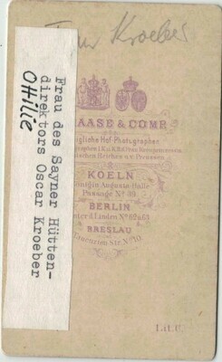 Schwarzweißfotografie, sog. Carte-de-Visite. Portraitaufnahme bzw. Brustbild von Ottilie Kroeber, Ehefrau des Hüttendirektors der Sayner Hütte Oscar Kroeber.
