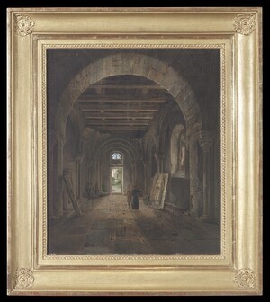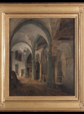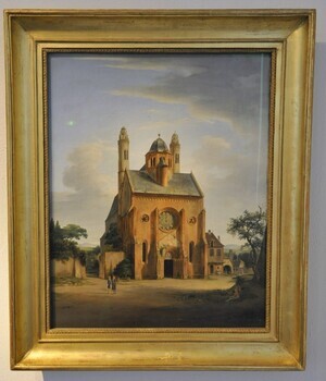 Die Ölstudie entstand im Zusammenhang mit dem Ölgemälde "Westfassade Pauluskirche in Worms" (HM_1925_0060) vom selben Sujet. Sie zeigt eine Ansicht der Westfassade der Pauluskirche in Worms. Der erste Bau von 1002 wurde im 13. Jahrhundert umgebaut. Die Bekrönung der Türme verweist auf orientalische Einflüsse. Die Kirche wurde 1689 teilweise zerstört und das Langhaus in Form einer Saalkirche neu errichtet. Das Stift wurde um 1800 aufgehoben. Nach einer Nutzung als städtisches Museum bis 1929 und Zerstörung im zweiten Weltkrieg gehört das Gebäude mit Kreuzgang heute zum Dominikanerkloster in Worms. Bernatz interessierte sich für das Gebäude als Zeugnis der mittelalterlichen Vergangenheit im Sinne einer romantischen Reminiszenz. Bezeichnet unten rechts von der Hand des Künstlers: "Pauluskirche in Worms/ August 1832". Zum Künstler: J1821 ging Johann Martin Bernatz zusammen mit seinem Bruder Matthäus nach Wien, um dort während der folgenden fünf Jahre die Bauschule zu besuchen. Matthäus Bernatz wurde schließlich Architekt. Johann Martin Bernatz begann 1825 eine weitere Ausbildung zum Architekturmaler an der kaiserlichen Akademie der Künste in Wien, die er 1829 abschloss. Ein Edikt des bayerischen Königs Ludwig I. vom 29. Mai 1827 bescherte dem jungen Johann Martin Bernatz 1830 einen ersten umfangreichen Auftrag. Der König forderte darin die Erstellung eines vollständigen Verzeichnisses, welches denkmalwürdige Bauten und Kunstwerke mit Plänen und Zeichnungen erfassen sollte. Bernatz wurde damit beauftragt, Zeichnungen von Kirchen, Klöstern und Römerbauten im Raum Straubing und Passau anzufertigen. Anschließend unternahm Bernatz etliche Wanderungen durch Süddeutschland, später auch durch das Salzburger Land und die Pfalz. Auf diesen Wanderungen entstanden zahlreiche Zeichnungen von Baudenkmälern, aber auch einige Landschaftsstudien. Die Skizzen bildeten die Grundlage der Ölgemälde, die Bernatz anschließend in seinem Münchner Atelier ausführte. Von 1836 bis 1837 begleitete Johann Martin Bernatz den Naturforscher und Professor für Naturgeschichte in München, Gotthilf Heinrich von Schubert, bei einer Exkursion ins Heilige Land. Bernatz fertigte Skizzen der wichtigsten biblischen Stätten an, die 1839 als Buchillustrationen veröffentlicht wurden. Bereits 1840 startete Bernatz zu seiner zweiten längeren Exkursion, die ihn zunächst nach Indien und dann über die arabische Halbinsel nach Ostafrika führte. Neun Monate der zweijährigen Reise verbrachte Bernatz bei dem Stamm der Danakil, elf Monate hielt er sich im Königreich Schoa auf. Aus dieser Zeit stammen spannende Illustrationen, die die fremdartigen Menschen und Bräuche wiedergeben. 1843 kehrte er von dieser Reise nach München zurück. Unter dem Titel „Scenes in Ethiopia“ erschien 1852 eine Edition mit 48 Farblithographien, die auf Bernatz´ Reiseskizzen basierten.