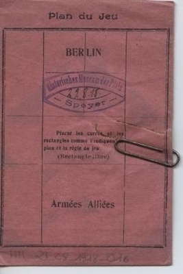 Französisches Kriegsspiel: "Kriegsspiel herausgegeben von der Chocolaterie der Union Lyon. Kriegsspiel oder Übernahme Berlins. ..."; darin befindet sich ein weiteres, etwas dickeres Papier mit aufgedrücktem Sigel