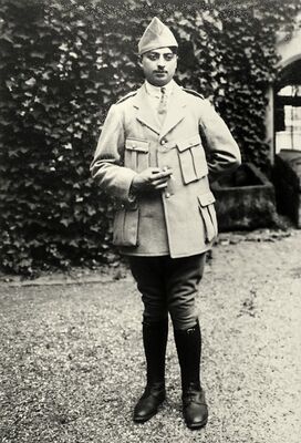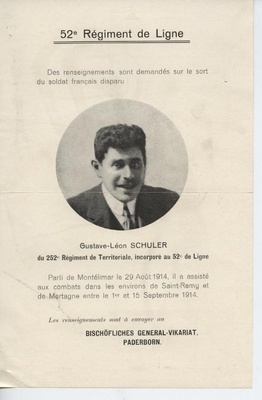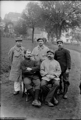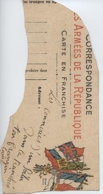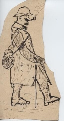 Zeichnung eines französischen Soldaten mit Pfeife; Rückseite: "Die Dummheiten eines französischen Soldaten im Graben, dein Bruder Louis" (Aus einer Postkarte herausgeschnitten)