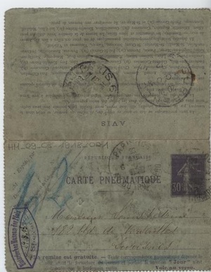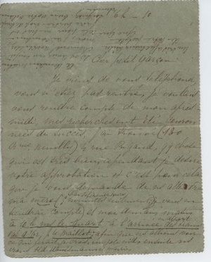 Adressat: Monsieur Louis Vedrine 182 bld de Versailles Suresnes; Text: "Cher petit garcon / Je viens de vous téléphoner, vous n’étiez pas rentré, je voulais vous rendre compte de mon après-midi, mes recherches ont été couronnées de succès, j’ai trouvé (130 Mme Neuilly) 4 rue Rigand, qq chose qui est trés bien, cependant je desire votre approbation et c’est pour cela que je vous demande de ns attendre. (par déférence pure) (5 minutes seulement, je vous en rendrai compte) ma mère et moi demain matin. à 10 h ms le quart à l’arrivée, ou départ des trains Val d’Or, p le maillot; afin que ns allions voir ce qui ferait, je crois, un joli (...), ensuite ns iront bld Haussmann et mairie, A demain matins, si vs aviez un empêchement, avertissez-moi, j’ai combiné cela pour ne pas vs faire perdre trop de temps. Soignez bien votre vilain rhume. Un très affectueux baiser de votre petite Gue Gue" Übersetzung: "Lieber kleiner Junge / Ich rief Sie gerade an, Sie gingen nicht dran, ich wollte Ihnen über meinen Nachmittag berichten, meine Recherchen sind mit Erfolg gekrönt worden, ich habe in der Rue Rigand Nummer 4 eine Sache gefunden, die sehr gut ist, allerdings wünsche ich Ihre Zustimmung und daher bitte ich sie, uns zu erwarten, meine Mutter (zur reinen Ehrerbietung) (nur 5 Minuten, ich versichere es Ihnen) und mich morgen früh. Um viertel vor 10 bei Ankunft oder Abfahrt der Züge an Val d’Or p le Maillot, damit wir das sehen werden, was wie ich glaube einen hübschen (...) macht, dann werden wir zum Boulevard Hausmann und zum Rathaus gehen. Bis morgen früh, wenn sie eine Verhinderung haben, dann warnen Sie mich, ich habe es so kombiniert, dass Sie nicht zu viel Zeit verlieren. Pflegen Sie Ihren bösen Schnupfen gut. Ein sehr leidenschaftlicher Kuss von Ihrer kleinen Gue Gue."