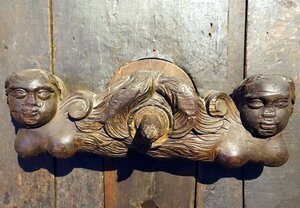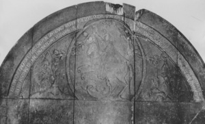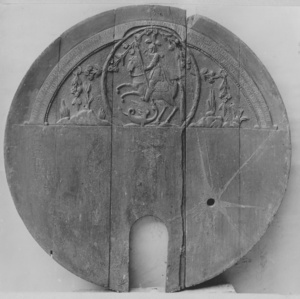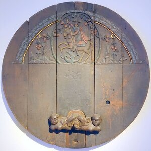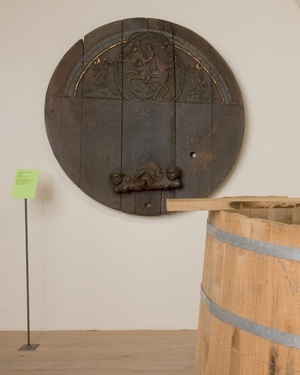 Großer, kreisförmiger geschnitzter Weinfassboden aus dem fränkischen Marktheidenfeld am Main. Im oberen Halbkreis ein flachreliefiertes Feld mit Schnitzerei: Darstellung des drachentötenden Hl. Georg im Hochoval. Darüber eine Inschrift mit derb-erotischer Anspielung: "Ich bin eine Jungfrau hubs (= hübsch) und fein, bin gemagt worden den 29 October 1794 von Valentin Reiss zu Marktheidenfeld an den Mein (= Main), wo man mich dud / anbohren so hab ich meine Jungfrauschaft verloren. Vivat Büdner (= Büttner = Küfer = Fassmacher; aber auch = Weinküfer) Kneckt (= Knecht) es kann nicht anders sein stecke den Hannen (= Weinfasshahn) drein." Geschenk des Weingutes von Bassermann-Jordan (Deidesheim) an das Historische Museum der Pfalz, um 1910. Türchen und Riegel fehlten ursprünglich. Für die aktuelle Dauerausstellung im Weinmuseum wurden die Teile aus dem Bestand ergänzt. (Ludger Tekampe, 2015)
