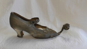 Ein einzelner Herrenschuh aus schwarzem und weißem Satin-Stoff. Spitze Form, dicke Sohle (ca. 2cm). Der Schuh verfügt über eine aufgesetzte und bestickte Kappe aus Stoff. Dieser Schuh stammt aus China. Datiert auf das späte 19. Jahrhundert.