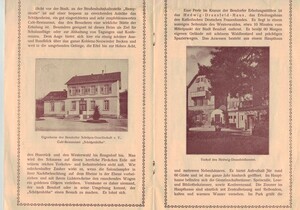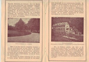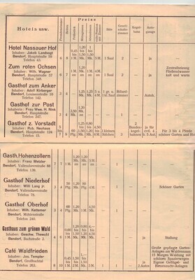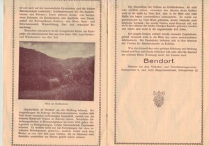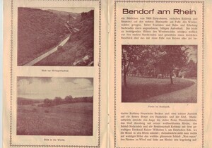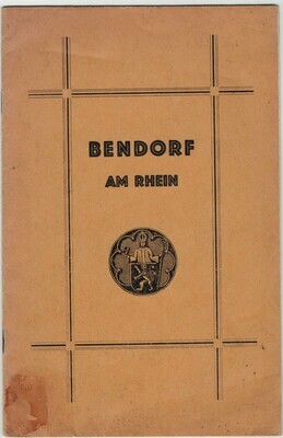 16-seitige Werbebroschüre für "Bendorf am Rhein" auf beigefarbenes Papier in Schwarzweiß bzw. Sepia um 1900 gedruckt. Der Einband besteht aus gelbfarbenem dünnen Karton. Die Broschüre wurde mit zwei Heftklammern geheftet und in der Buchdruckerei Schwenkmezger in Bendorf gedruckt. Es wird beschrieben, dass der ort mit der Staßenbahn oder der Dampfschifffahrt zu erreichen ist. Als Orte der Erholung oder Sehenswürdigkeiten werden in Bendorf das Großbachtal und das Wenigerbachtal, der Stadtpark, das Café-Restaurant Schützenhöhe, das Hedwig-Dransfeld-Haus, das Café und Erholungsheim "Waldfrieden" und die Kirchen vorgestellt.
