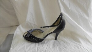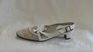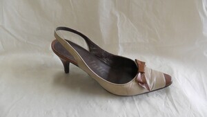 Ein Paar Pumps aus dunkelbraunem Leder. Spitze Form, mit Leder bezogener und metallgenagelter Pfennigabsatz (ca. 5,5cm). Die Schuhe verfügen über je eine Schleife aus Leder, welche um eine Schnalle aus Metall gebunden ist. Die Seiten der Schuhe sind mit je einem eingefassten Gummizug versehen. Datiert auf 1964.