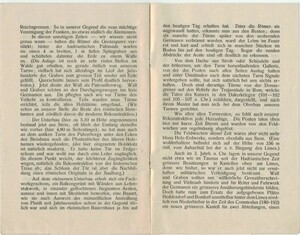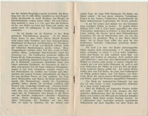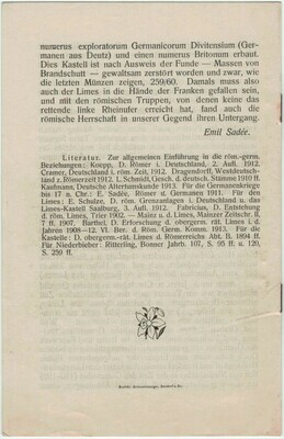 8-seitige gedruckte Broschüre. Anlässlich des 20-jährigen Jubiläums der Erbauung des sog. Römerturms auf dem Pulverberg in Bendorf-Sayn wurde ein Sonderdruck in der Druckerei Schwenkmezger in Bendorf hergestellt. Es ist eine Veröffentlichung eines Aufsatzes von Emil Sadée mit dem Titel "Der Römerturm auf dem Pulverberg bei Sayn. Römische Grenzbefestigung. Errichtet 1912 in historischer Treue."