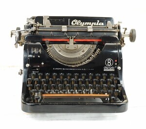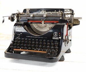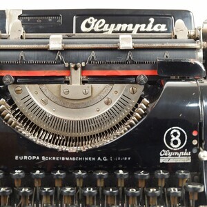 Unser Exponat ist eine schwarz lackierte, mechanische Büroschreibmaschine, mit der Bezeichnung Olympia 8. Hergestellt unter der Nummer 235.744 im Jahr 1936 von der Europa Schreibmaschinen AG Berlin- Erfurt. Neben der üblichen, reichhaltigen Ausstattung, bietet die Olympia 8 noch einige Besonderheiten. Dazu gehört die einstellbare S p e r r s c h r i f t, die seitlich integrierten Fabbandspulen, eine Kippwagenschaltung (mit der der Wagen bei der Umschaltung nicht wie sonst üblich gehoben, sondern gekippt wurde) ein Dauerkalender mit dem die Sekretärin das jeweilige Tagesdatum per Drehrädchen eingestellte. Gebaut wurde das Modell von 1936 bis 1948. Soweit wir die Geschichte unserer Büromaschine nachverfolgen konnten, wurde sie von der Werksniederlassung Frankfurt/M. Schillerstrasse 2 an das Stahlwerk Dillinger Hütte verkauft. Dort arbeitete die Sekretärin Marga Jung, ihr Leben lang mit dieser Maschine. Als Frau Jung in Rente ging, war es auch, für die inzwischen betagte Schreibmaschine, Zeit zur Ausmusterung. So gelange die Olympia in den persönlichen Nachlass von Frau Jung, die mit 92 Jahren verstarb. Ihre Erben vermachten das betagte Modell unserem Museum.