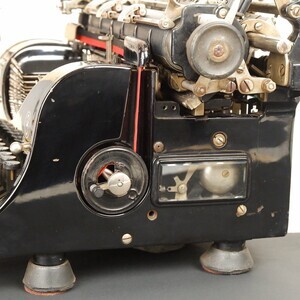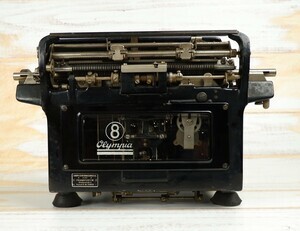 Unser Exponat ist eine schwarz lackierte, mechanische Büroschreibmaschine, mit der Bezeichnung Olympia 8. Hergestellt unter der Nummer 235.744 im Jahr 1936 von der Europa Schreibmaschinen AG Berlin- Erfurt. Neben der üblichen, reichhaltigen Ausstattung, bietet die Olympia 8 noch einige Besonderheiten. Dazu gehört die einstellbare S p e r r s c h r i f t, die seitlich integrierten Fabbandspulen, eine Kippwagenschaltung (mit der der Wagen bei der Umschaltung nicht wie sonst üblich gehoben, sondern gekippt wurde) ein Dauerkalender mit dem die Sekretärin das jeweilige Tagesdatum per Drehrädchen eingestellte. Gebaut wurde das Modell von 1936 bis 1948. Soweit wir die Geschichte unserer Büromaschine nachverfolgen konnten, wurde sie von der Werksniederlassung Frankfurt/M. Schillerstrasse 2 an das Stahlwerk Dillinger Hütte verkauft. Dort arbeitete die Sekretärin Marga Jung, ihr Leben lang mit dieser Maschine. Als Frau Jung in Rente ging, war es auch, für die inzwischen betagte Schreibmaschine, Zeit zur Ausmusterung. So gelange die Olympia in den persönlichen Nachlass von Frau Jung, die mit 92 Jahren verstarb. Ihre Erben vermachten das betagte Modell unserem Museum.