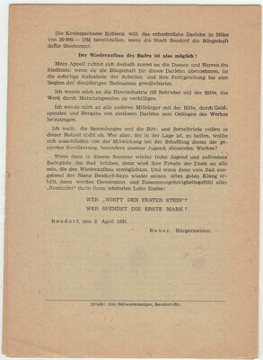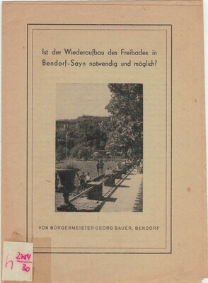8-seitige Broschüre am 2. April 1951 herausgegeben von Bürgermeister Bauer, anlässlich des Wiederaufbaus des Freibads in Bendorf-Sayn. Das Freibad im Sayntal, in unmittelbarer Nachbarschaft der Sayner Hütte, war auf Anregung des Beigeordneten der Stadt Bendorf und Brauereibesitzers, Max Hünermann erbaut und 1931 eröffnet worden. 1942 war das Gebäude mit den Umkleidekabinen abgebrannt. Mit dieser Werbeschrift möchte der Bürgermeister der Stadt Bendorf Förderer für den Wiederaufbau des Freibades gewinnen. Sie wurde in der Druckerei "Joh. Schwenkmezger, Bendorf-Rh." gedruckt.
