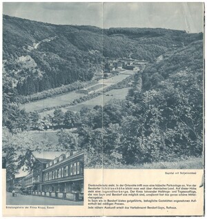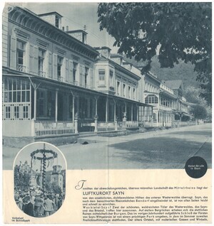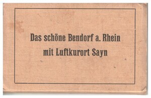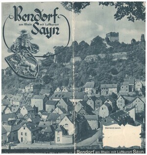 In Schwarzweiß gedrucktes 12-seitiges Werbefaltblatt für "Bendorf am Rhein mit Luftkurort Sayn" aus dem Jahre 1937. Das Faltblatt ist bebildert mit Fotografien von Sehenswürdigkeiten und Hotels sowie kleinen Zeichnungen. Es sind Fotografien vom Luftkurort Sayn abgebildet wie von der "Hotel-Straße in Sayn" (heute Koblenz-Olper-Straße) mit dem Erholungsheim der Firma Krupp in Essen, der Abteikirche mit Kreuzgang, der Burgruine, des Freibads im Sayntal, dem Römerturm und dem Brexbachtal mit dem Bahnviadukt. Außerdem wird ein Blick in den Stadtpark in Bendorf veröffentlicht. Der Tourist erhält Informationen zu den Örtlichkeiten und zur Verkehrsanbindung.