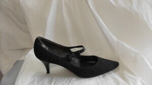 Ein Paar Pumps aus dunkelblauem Veloursleder. Spitze Form, mit Veloursleder bezogener Absatz (ca. 4cm). Die Schuhe verfügen über je eine Schleife aus Veloursleder und Leder, sowie mehrere Streifen aus Leder. Hergestellt für die Marke Gabor. Datiert auf 1969.
