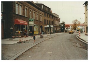 Farbfotografie, die einen Blick auf die Hauptstraße in Bendorf zeigt. Im Hintergrund ist das neu erbaute Einkaufszentrum Kaufland, im Vordergrund die Straße selbst während des Aufbringens des neuen Straßenbelags und links die Häuser Hauptstraße 117-119 zu erkennen. Dem Neubau des Einkaufszentrum war der Abriss der Fabrikgebäude der Firma Didier 1999 vorausgegangen.