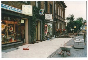 Farbfotografie aus dem Jahr 2000, die einen Blick auf die Hauptstraße in Bendorf zeigt. Im Hintergrund ist das neu erbaute Einkaufszentrum Kaufland, im Vordergrund der Bürgersteig während der Pflasterarbeiten und links die Häuser Hauptstraße 117-119 zu erkennen. In den Gebäuden waren im Jahr 2000 ein Augenoptiker- und ein Friseur-Geschäft sowie eine Arztpraxis untergebracht. Dem Neubau des Einkaufszentrum war der Abriss der Fabrikgebäude der Firma Didier 1999 vorausgegangen.
