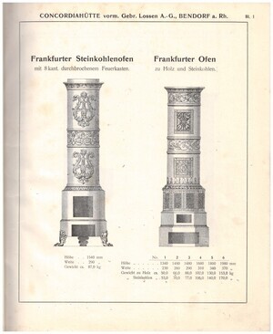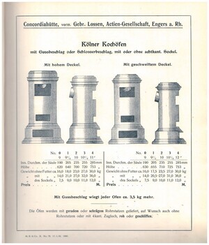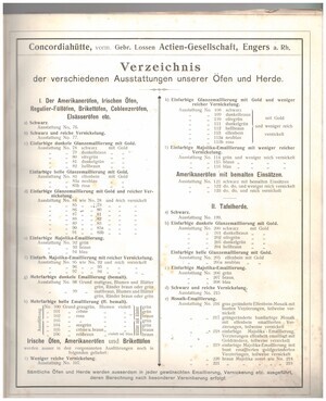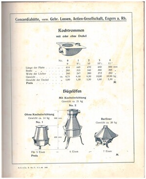122 gedruckte Seiten mit Produkten der Concordiahütte zu einem Buch gebunden mit Einband aus festem Karton. Es handelt sich um einen Warenkatalog der Concordiahütte von 1905, in dem überwiegend Gussöfen und Herde angeboten werden. Der Einband ist vorne beschriftet mit "Gusswaaren-Abbildungen von Concordiahütte vorm. Gebr. Lossen Act. Ges. Bendorf a. Rh."