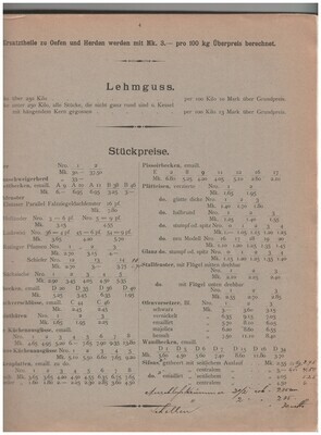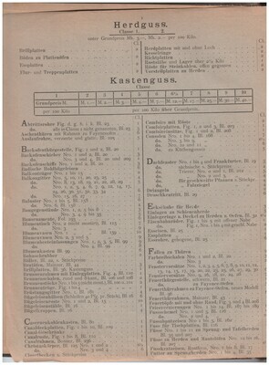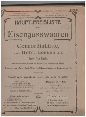 Einzeln gedruckte Seiten mit Produkten der Concordiahütte zu einem Buch gebunden mit Einband aus festem Karton und Leinenbindung. Es handelt sich um einen Warenkatalog der Concordiahütte von 1903-1905, in dem überwiegend Gussöfen und Herde angeboten werden. Das Deckblatt innen ist u.a. beschriftet mit "HAUPT-PREISLISTE über Eisengusswaaren. Condordiahütte. vorm. Gebr. Lossen A. G. Bendorf a. Rhein."