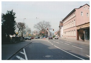 Farbfotografie aus dem Jahr 1999 von Klaus Geißler. Die Aufnahme zeigt einen Blick auf die Kreuzung Alter Weg / Hauptstraße und das Geschäftshaus Carl W. Neuhaus, Bendorf, Hauptstraße 128 in Bendorf. Über den Schaufenstern ist folgender Schriftzug zu lesen: "CARL W. NEUHAUS WERKZEUGE - BESCHLÄGE - EISENWAREN". Das Geschäft wurde von Inhaber Willi Neuhaus und zuletzt von seiner Tochter Inge bis zur Geschäftsaufgabe geführt. Heute ist das Gebäude abgerissen und der Neubau eines Wohn- und Geschäftshauses geplant.