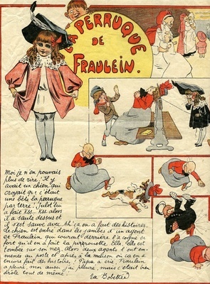 Doppelseite als Beilage zum Magazin "La joie des enfants". Bildergeschichte mit Überschrift: "Les Aventures extraordinaires de Julot et de Bobette. La perruque de Fraulein."